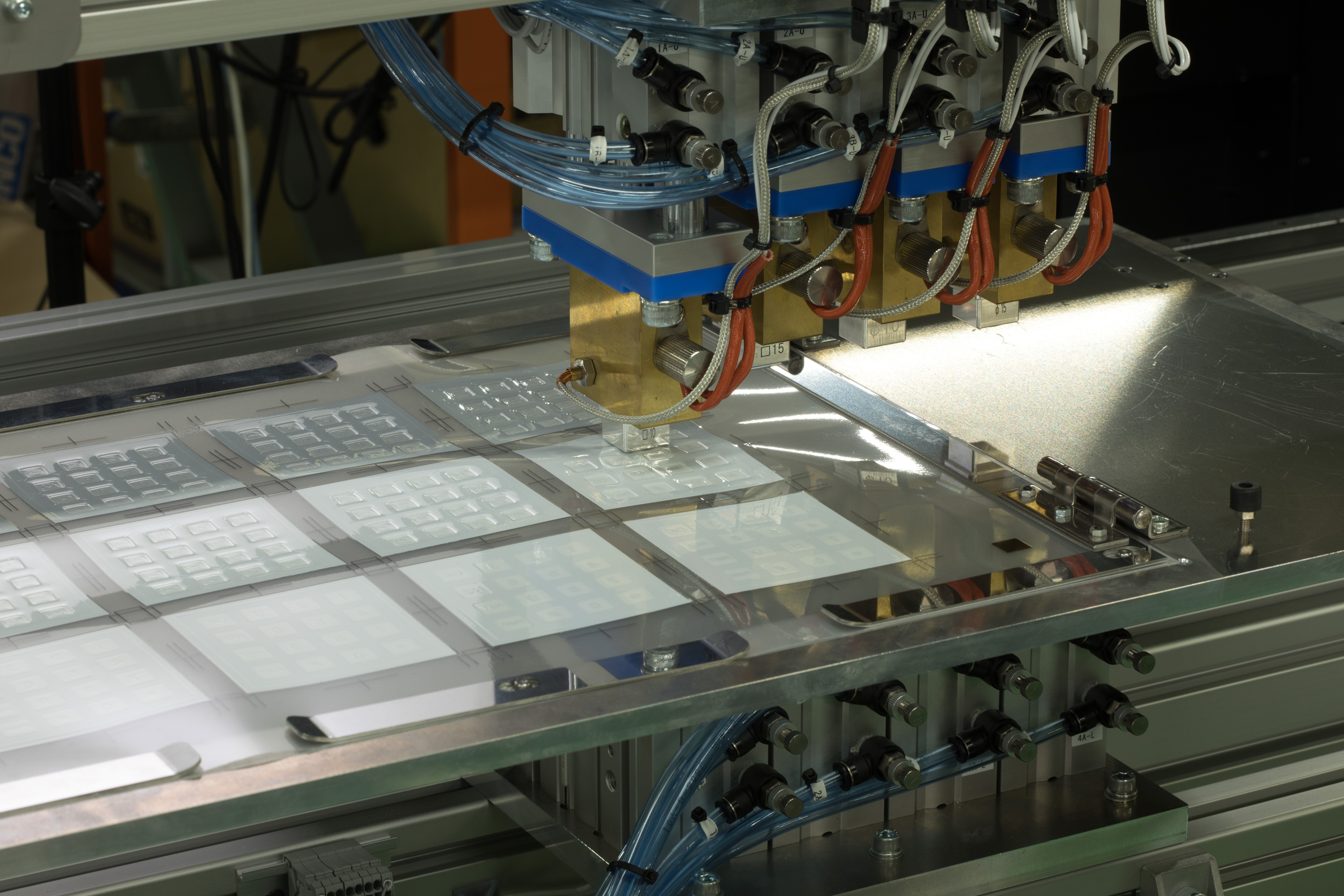 タカチではNCエンボス加工機を導入し、「金型製作の初期費用ゼロ」でクリックボタン付シートが製作可能です。