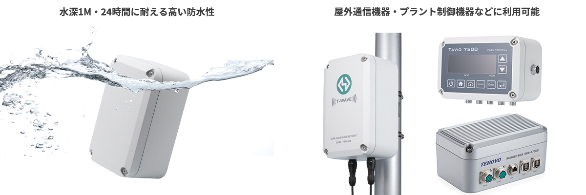 屋外通信機器、プラント制御機器、気象測定器など、厳しい環境での使用に適しています。