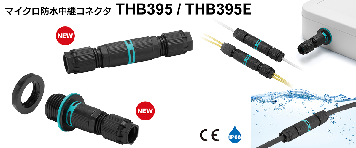 コンパクトサイズ IP68防水中継コネクタTHB395・THB395Eシリーズ発売!THB395シリーズはφ14mm・全長76mmでストレートタイプ、THB395Eシリーズはφ14mm・全長55.5mmで筐体やパネルにマウントタイプの防水コネクタです。